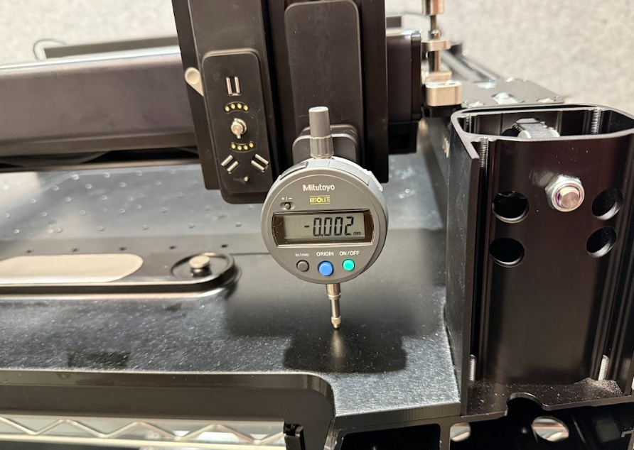Turn the dial indicator on. Press and hold the ORIGIN button to zero the dial indicator. Take note of the value on the dial indicator.