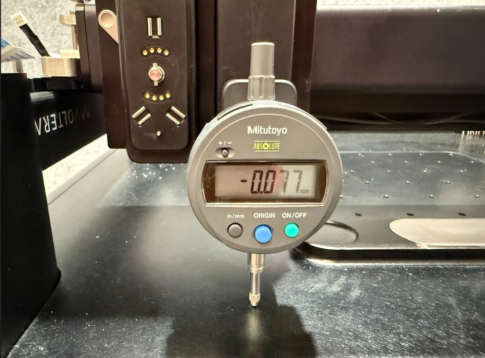 Bring the bridge to the front of NOVA and manually lower the tool port by pressing down on the top of the port with your thumbs. Lower the tool port until the dial indicator pushes into NOVAs body.
