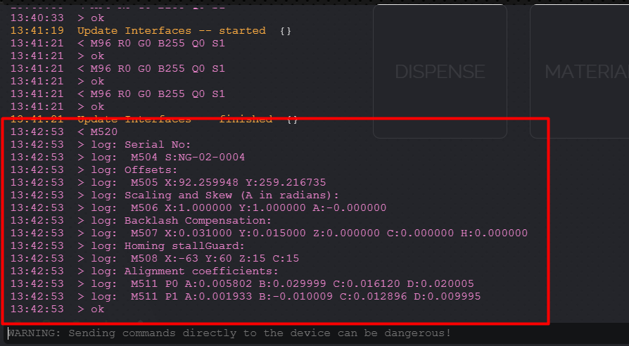 Our support team will now give you a list of commands to copy and paste into the console that will save your previous calibration values to the new control board.