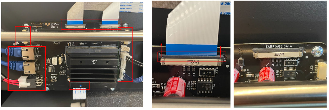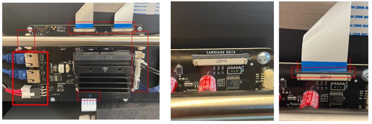 Plug in the cables for the power button, leds, motors, vacuum board, ribbon cables and port board. Again being gentle with the ribbon cables when plugging them back in.